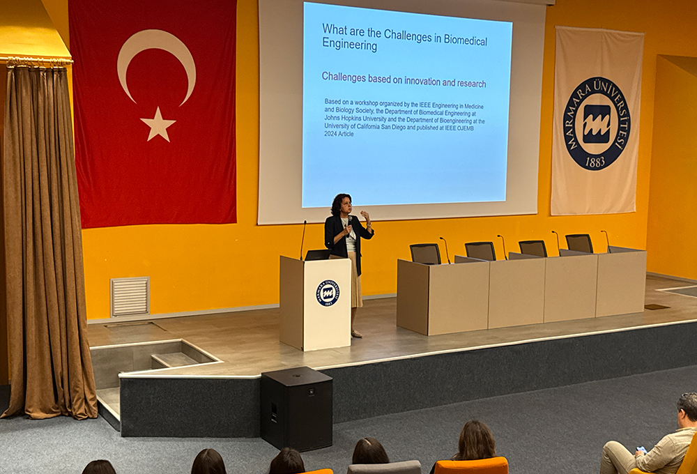 Elektrik-Elektronik Mühendisliği Bölüm Başkanımız Doç. Dr. Esra Saatçı, IEEE Engineering in Medicine & Biology Society (EMBS) Türkiye Öğrenci Kolu’nun 18-19 Ekim 2025 tarihlerinde düzenlediği EMBCO’25 Konferansı’nda davetli konuşmacı olarak yer aldı. Hocamız konferansta, “Challenges and Opportunities in Biomedical Engineering” başlıklı sunumunu gerçekleştirdi.